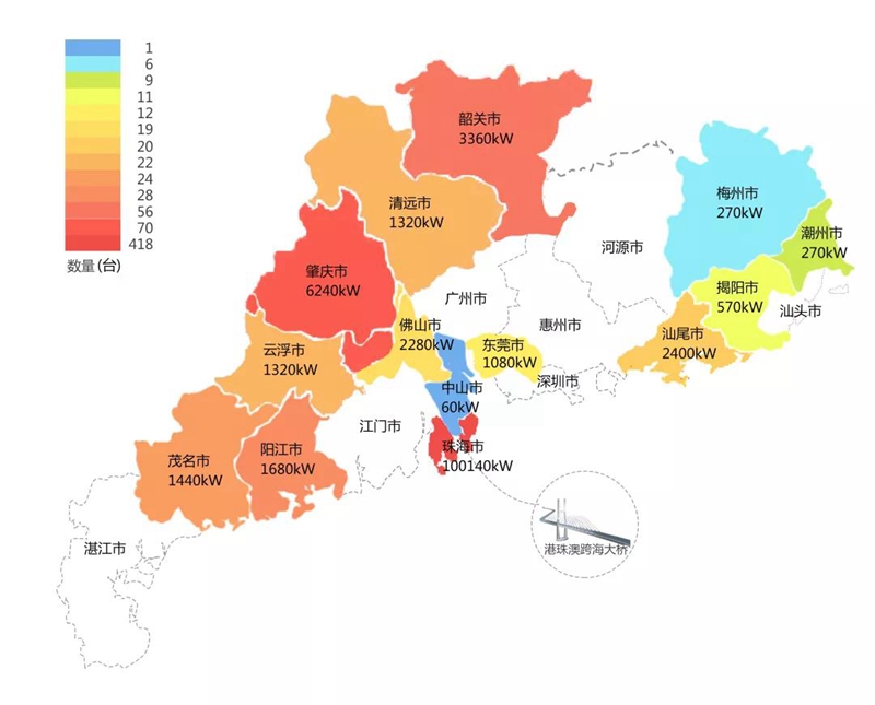 2018年,在港珠澳大桥充电桩项目中,山西广威建筑工程有限公司在港珠澳大桥珠海端口岸人工岛搭建的充电管理平台及电能量采集终端,为大桥的绿色运营和电力保障提供技术支持。除此之外,仅广东省内,山西广威建筑工程有限公司充电桩涵盖肇庆、珠海等14个城市,具体分布情况如下图所示。